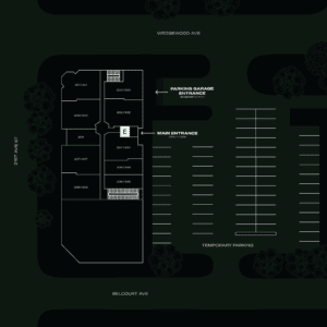 The building entrance is located at the back, facing the parking lot. Look for the Mint House sign above the doors. At the callbox, enter the building code found in your arrival details to unlock the door and proceed to the lobby.