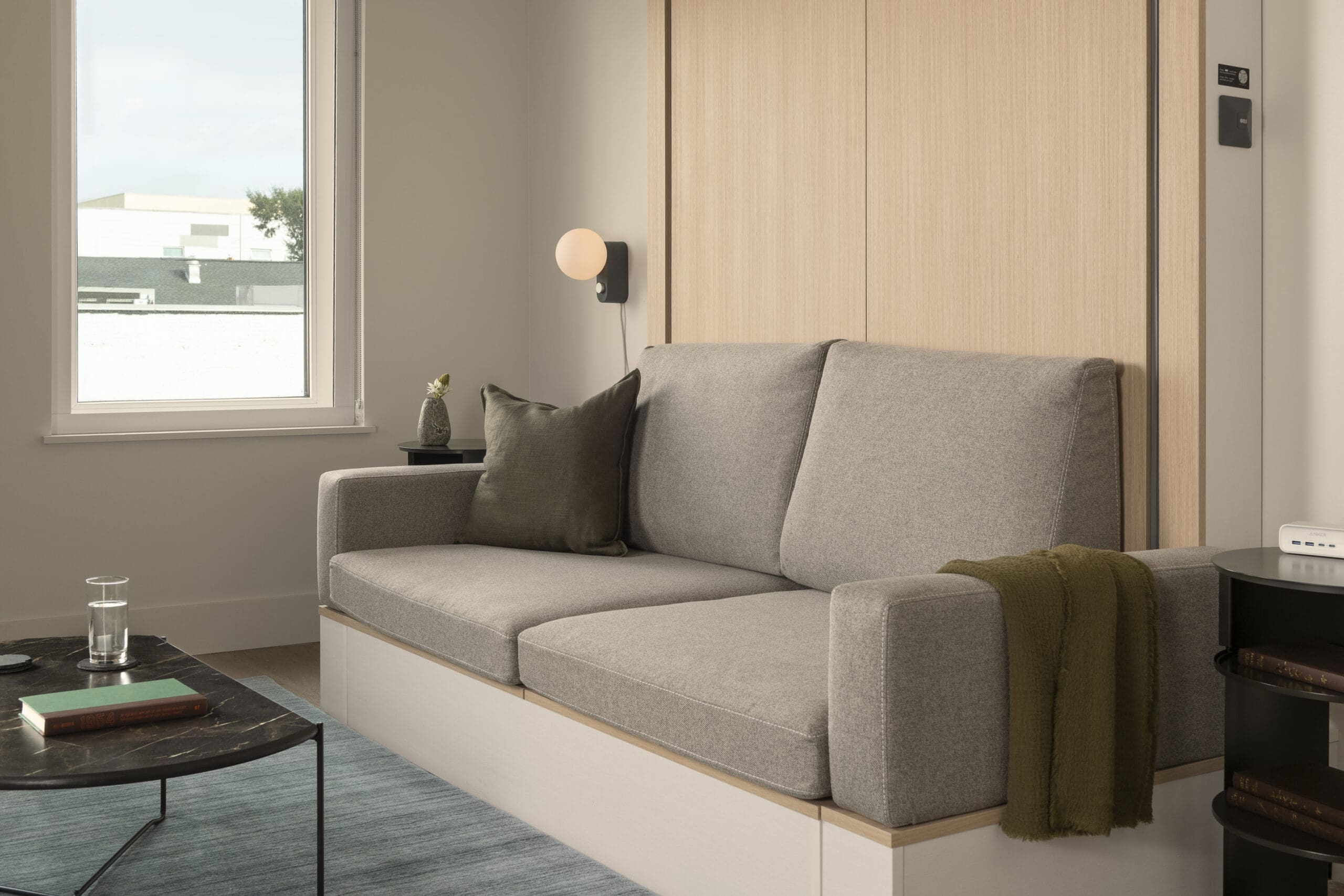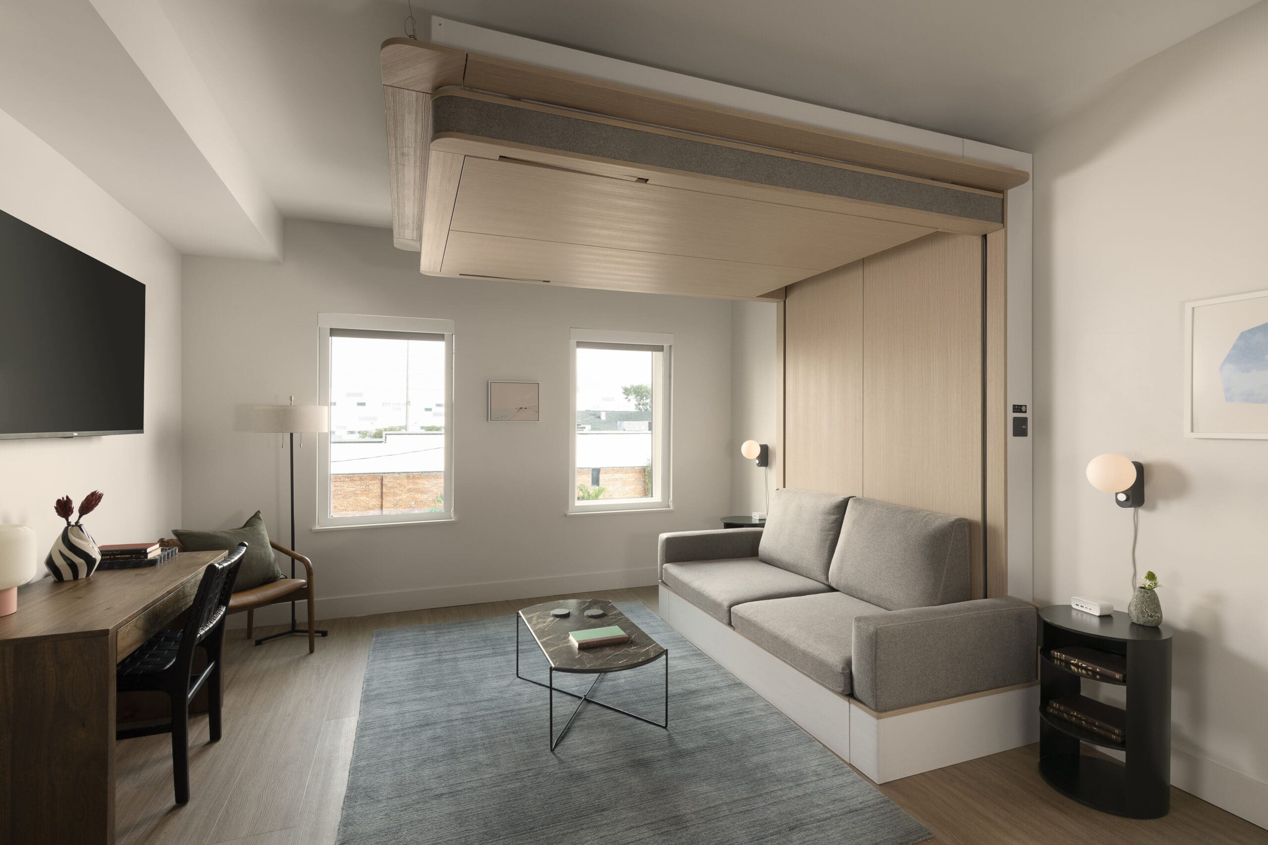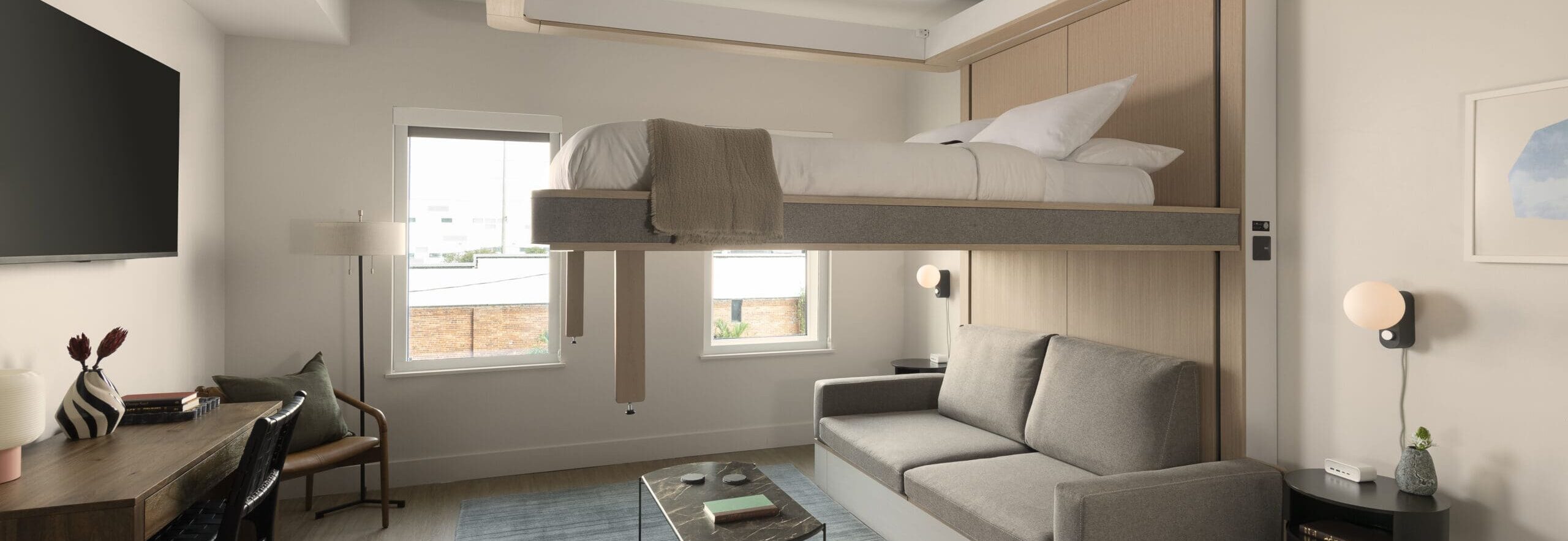Sleek, space-saving bed system that effortlessly extends from the ceiling for added comfort and flexibility.