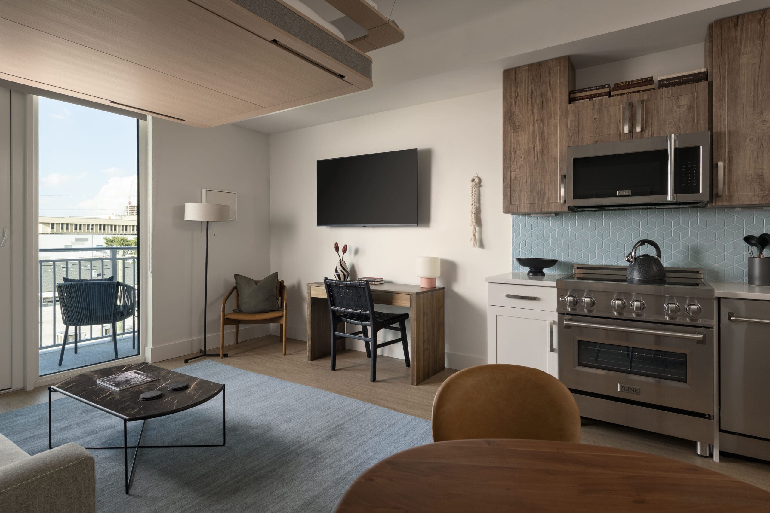 View On MapAt Mint House Tampa — Downtown, you’ll find the space and amenities to make your stay seamless. Cook your favorite meals in a full kitchen, take advantage of in-unit laundry, unwind by the outdoor plunge pool, or fit in a workout at the fitness center. Whether you’re here for work, an event, or a weekend escape, you’ll have everything you need to feel at home.